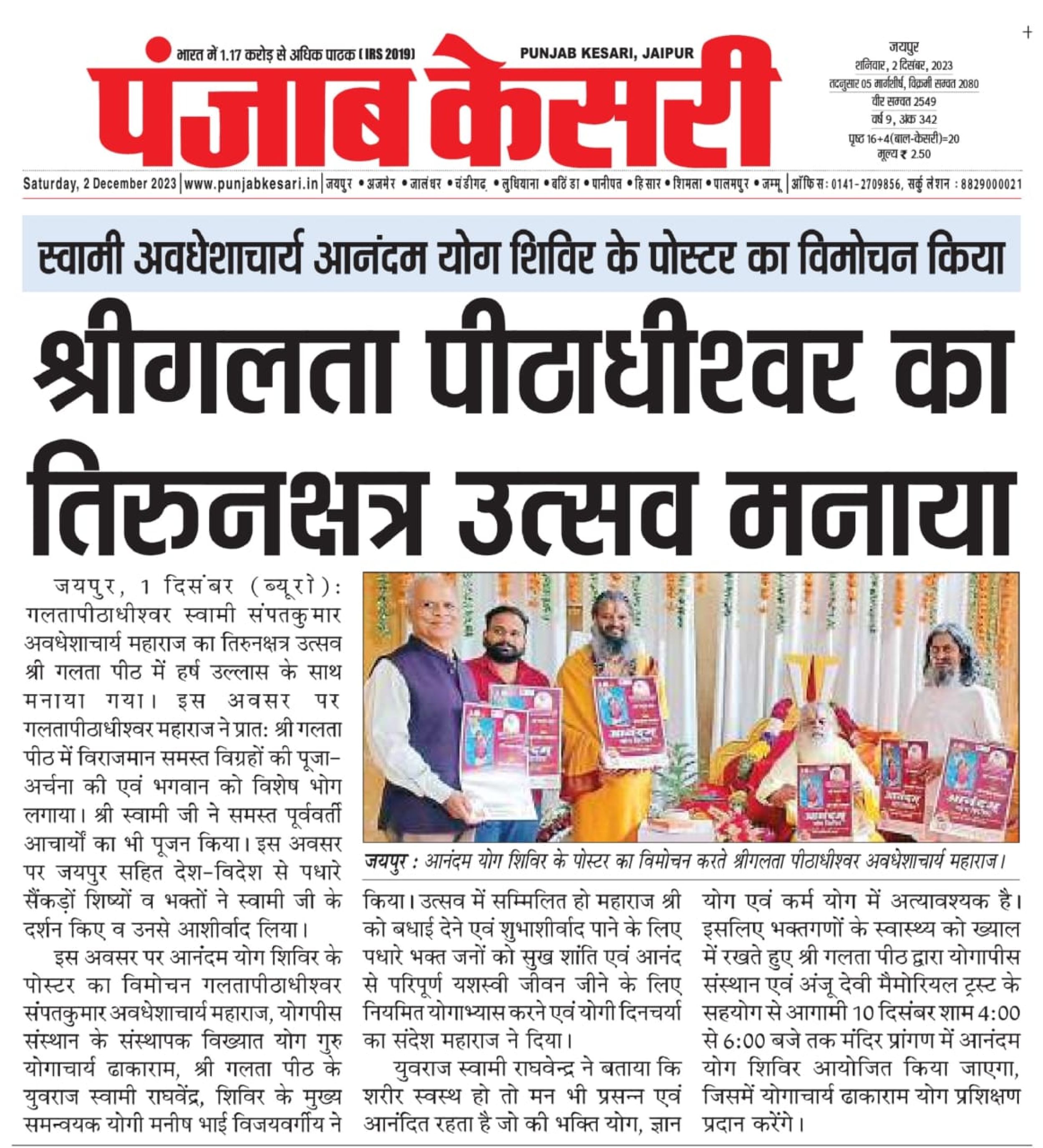 आनंदम योग शिविर पोस्टर का विमोचन हुआ – गलता पीठाधीश्वर स्वामी अवधेशाचार्य जी महाराज का तिरुनक्षत्र श्री गलता पीठ में मनाया गया