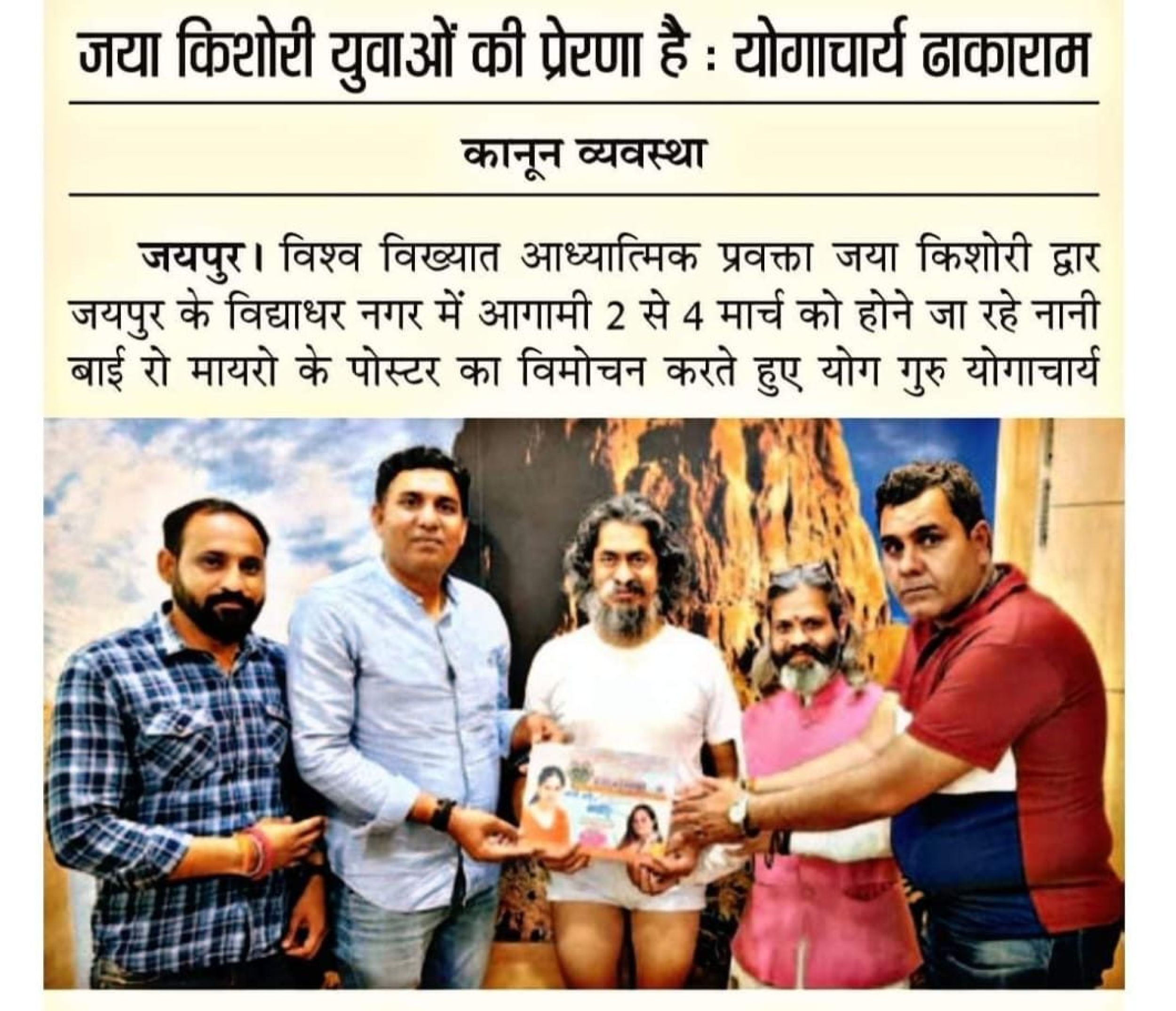 विश्व विख्यात आध्यात्मिक प्रवक्ता जया किशोरी द्वार जयपुर के विद्याधर नगर सेक्टर 7 स्थित अग्रसेन पार्क के सामने 2 से 5 मार्च तक विद्याधर नगर स्टेडियम आयोजन समिति जयपुर द्वारा आयोजित होने जा रहे नानी बाई रो मायरो के पोस्टर का विमोचन करते हुए योग गुरु योगाचार्य ढाकाराम ने कहा कि जया किशोरी के बचपन से उदित भक्ति भाव ने उन्हें एक आधुनिक युवा कथावाचक के रूप में देश विदेश में विख्यात किया है वे धर्म और भक्ति के आधार पर करोड़ों युवाओं की प्रेरणा बन गई है, आधुनिक समय की युवा मोटिवेशनल आईकॉन बनी जया किशोरी जी के पोस्टर का विमोचन करते हुए मुझे खुशी है,उनका जयपुर आगमन धर्म प्रेमियों के लिए सात्विक ऊर्जा के साथ धार्मिक उल्लास उमंग का सेतु बनेगा।